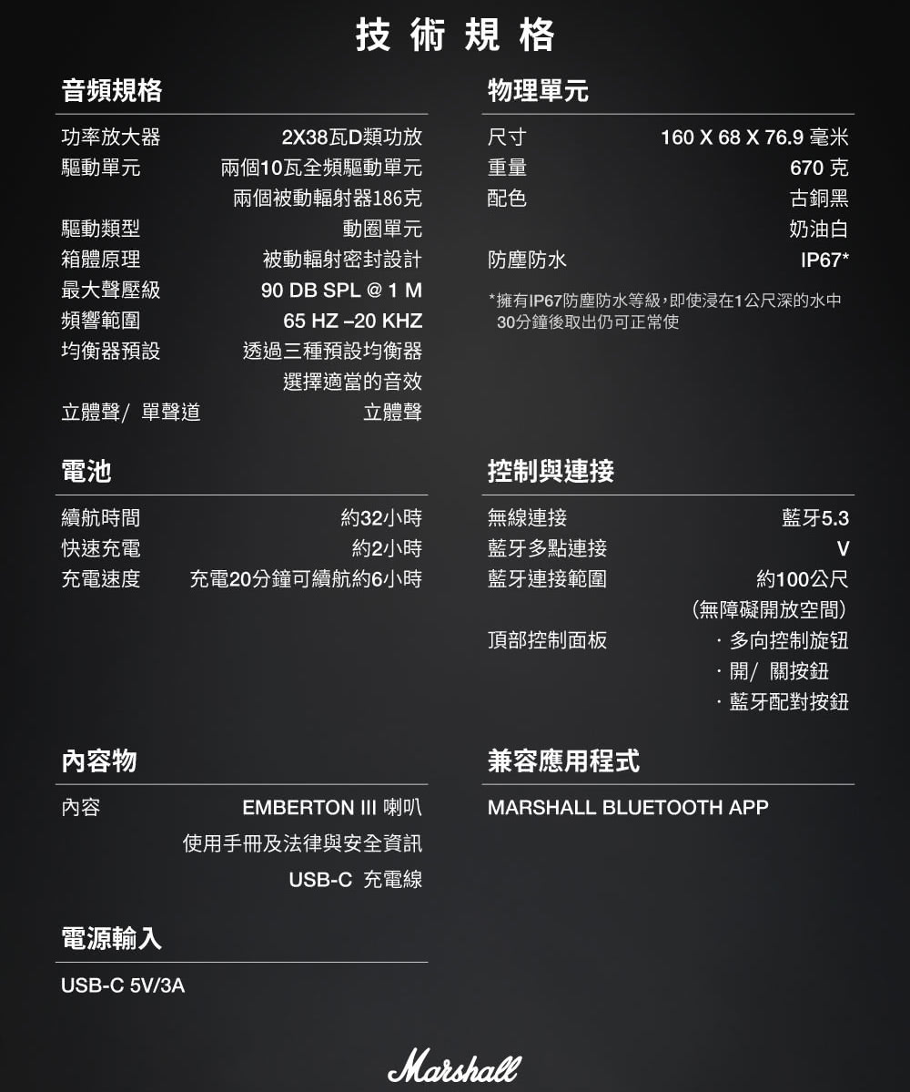 Marshall Emberton III 攜帶式藍牙喇叭(公司貨)